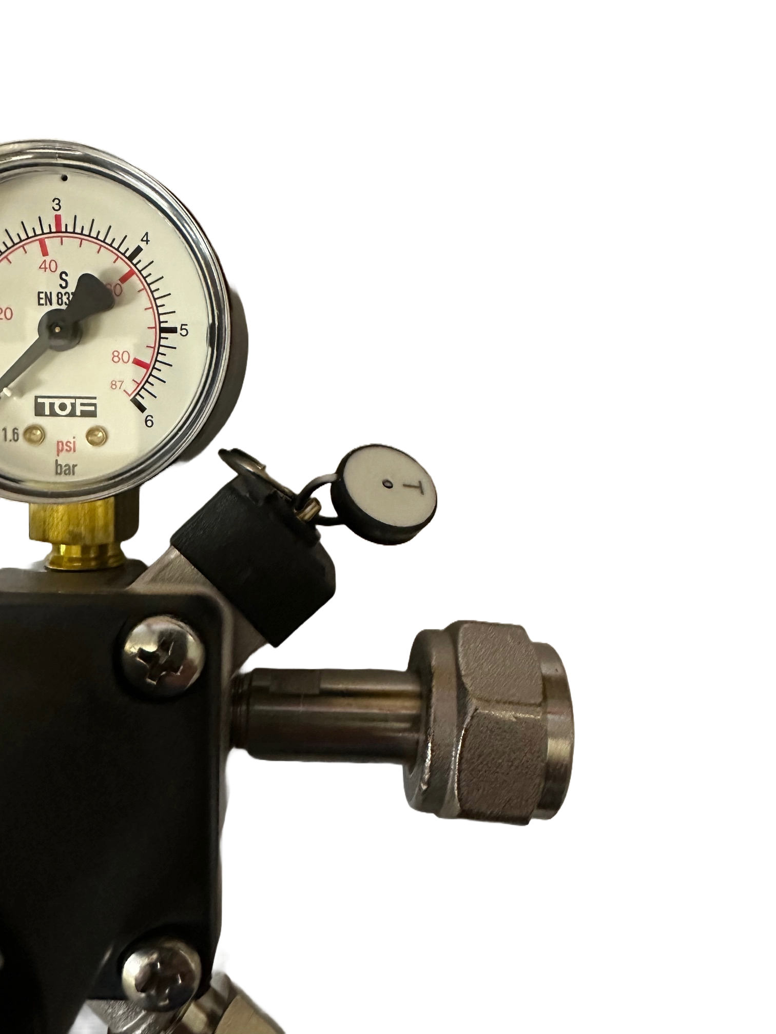 Bier Druckminderer für Zapfanlage mit einem Arbeitsdruck von 0-6/3 bar und ausgestattet mit Sicherheitsventil, Arbeitsmanometer und Inhaltsmanometer.