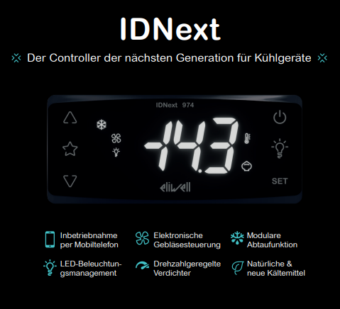 Die herausragende technische Regelzuverlässigkeit der Kühlstellen wird im neuen IDPlus durch ein größeres Display, farbige Symbole und die abgerundete Frontblende implementiert; mit Display in den Farben Blau, Bernstein und Rot sowie weißer, blauer und dungelgrauer Frontblende erhältlich.